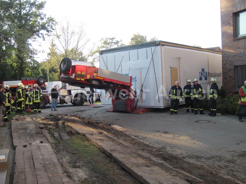 Auf dem Gelände der UEK Aurich finden zur Zeit Bauarbeiten anlässlich der Errichtung zweier Linksherzkathetermessplätze statt. Während der Anlieferung eines Containers musste der Fahrer der Zugmaschine die befestigte Straße aufgrund des großen notwendigen Wenderaduis verlassen. Dabei sackte die Zugmaschine im weichen Untergrund ein. Der gesamte Zug hatte ein Gewicht von 68 Tonnen.