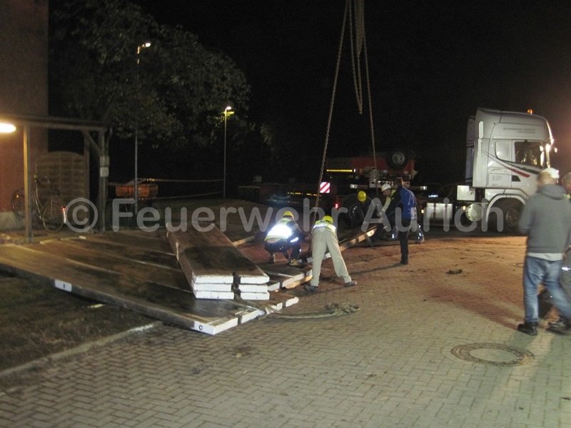 Gegen 17 Uhr entschied man, die Feuerwehr Aurich zu alarmieren, um den Zug aus seiner Lage zu befreien.Die Feuerwehr rückte mit dem Rüstwagen aus Sandhorst, dem HLF, dem GWL1 und dem ELW aus Aurich an. Die Schwerlasthebekkissen (bis 85 t) des GWL1 sollten jedoch nicht zum Einsatz kommen.