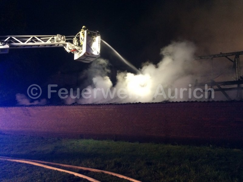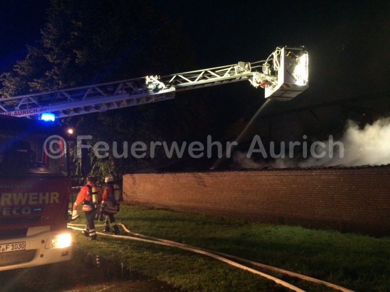 Nachdem bei der ausgelösten Brandmeldeanlage in der Raiffeisenstraße feststand, dass es sich um einen Fehlalarm handelte, wurde die DLK zu einem Großbrand nach Westersander angefordert. Dort brannte ein landwirtschaftliches Gebäude in voller Ausdehnung.