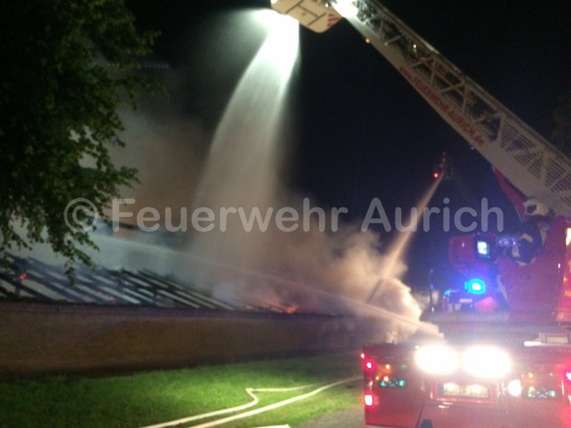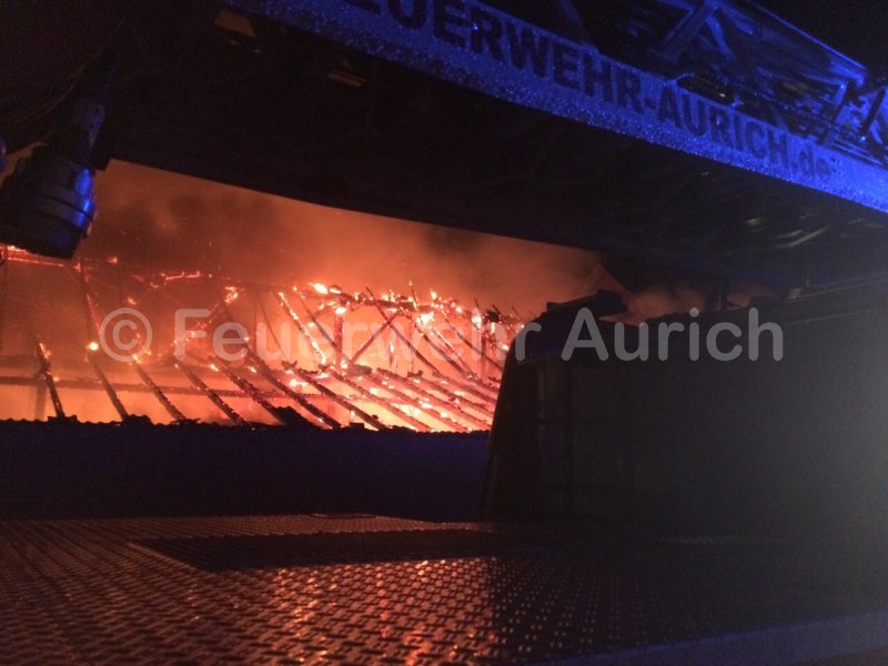 Zusammen mit der Drehleiter aus Simonswolde wurde die Brandbekämpfung über zwei Monitore von oben durchgeführt. Gleichzeitig wurde durch einen Innenangriff der Übergriff der Flammen auf den Wohntrakt verhindert werden. Im Einsatz waren nahezu alle Ortsfeuerwehren der Gemeinde Ihlow, der ELW 2 der OF Middels und die DLK aus Aurich, die nach ca. 2,5 Stunden wieder die Heimfahrt antreten konnte.