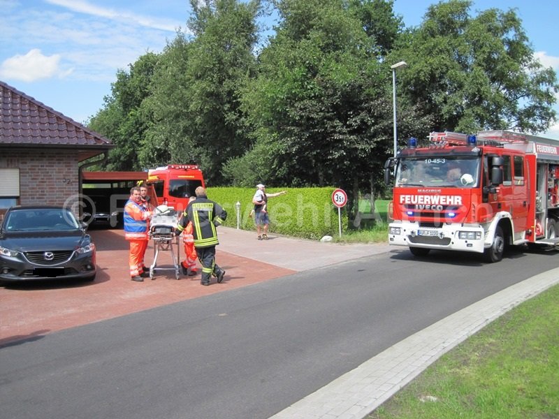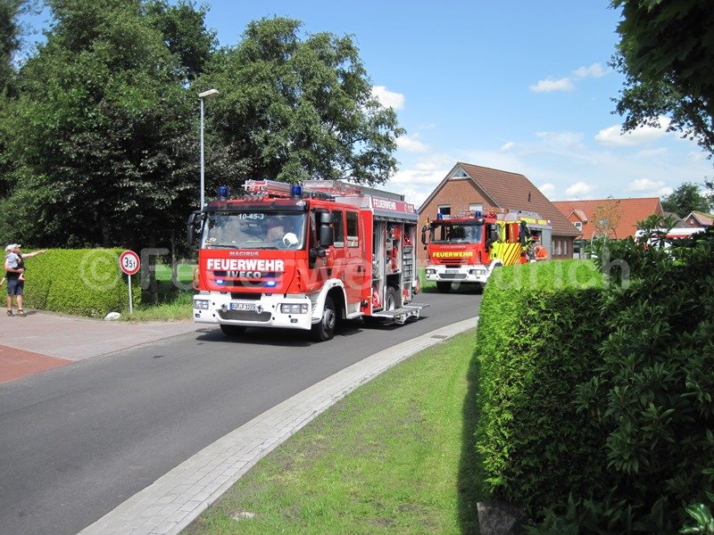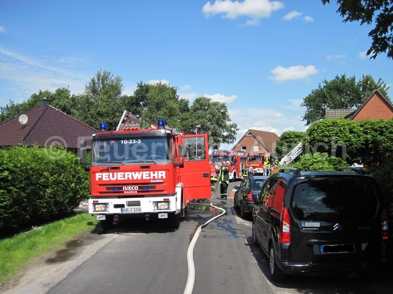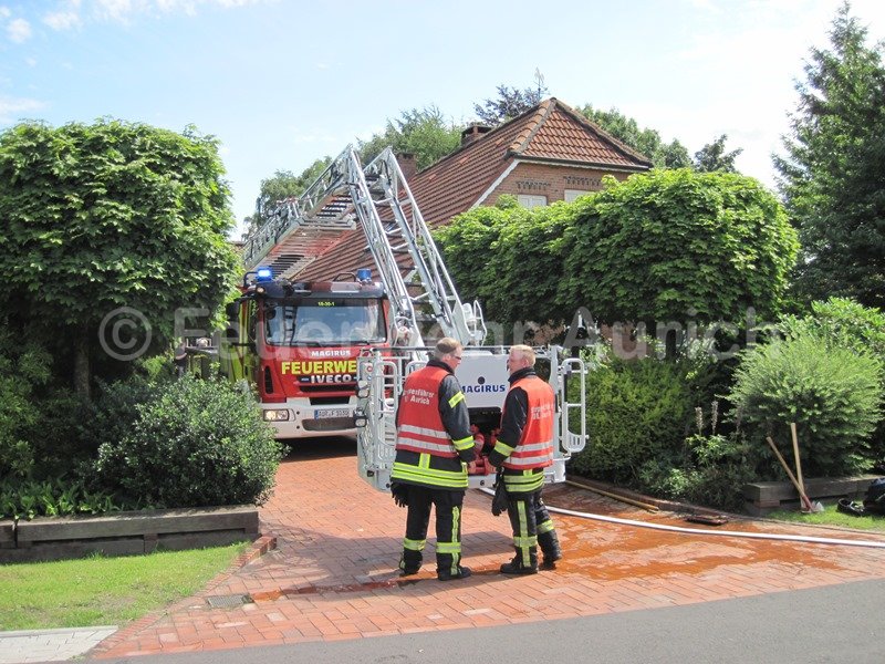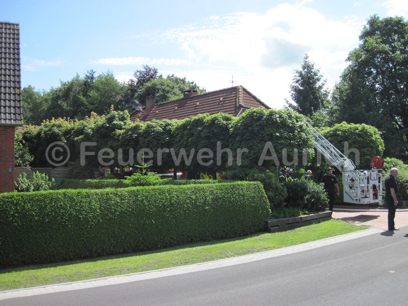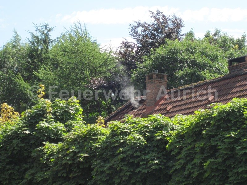 Die Ortsfeuerwehr Aurich und die DRK Bereitschaft Aurich wurden am Mittag zur Unterstützung der Ortsfeuerwehr Haxtum alarmiert. Anfangs rückte man mit der Drehleiter und dem ELW (samt Wärmebildkamera) zur Einsatzstelle aus. Anrufer meldeten Rauch aus einem Dachstuhl. Der erste Eindruck bestätigte diese Meldung, was zusätzlich zu den beiden Haxtumer Löschfahrzeugen die Nachforderung des Auricher HLF zur Folge hatte. Während der Einsatzleiter die Einsatzstelle von innen erkundete, wurden Löschangriffe über die DLK und als Innenangriff vorbereitet. Zahlreiche Atemschutztrupps standen ebenfalls bereit. Nach schweißtreibender Entfernung des Dämmmaterials auf dem Dachboden stellte sich der Rauch als Wasserdampf aus einem Überdruckventil der Solaranlage dar. Die Heißwasserleitung wurde entlang des Firstes über das Dach geführt. Alle vorbereitenden Maßnahmen konnten abgebrochen werden. Ab jetzt war dieser Einsatz ein Fall für einen Heizungsfachmann.