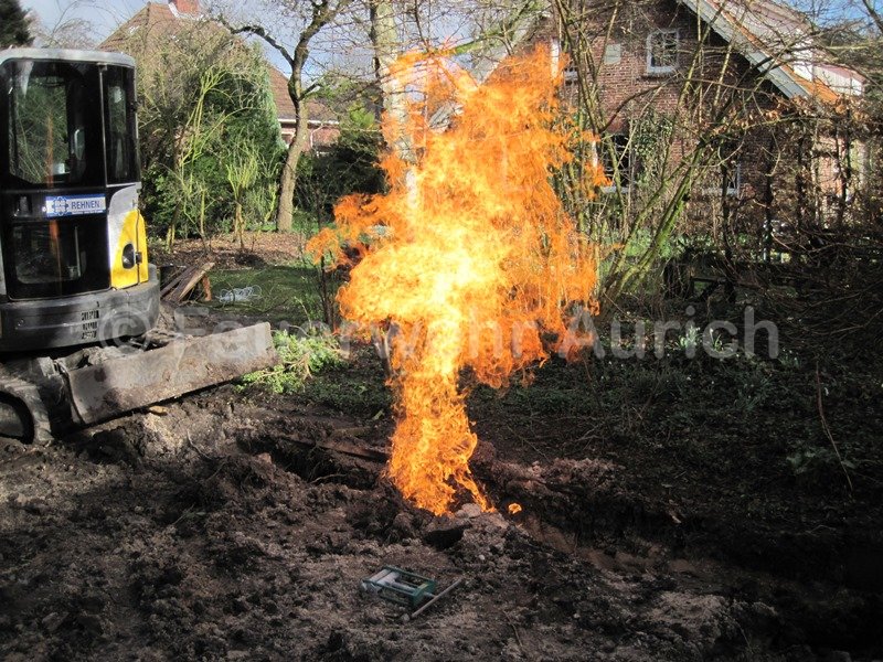 Beim Eintreffen der ersten Einsatzkräfte strömte Gas aus einer Baugrube aus. Ein Bagger hatte eine Gasleitung beschädigt. Polizei und Feuerwehrkräfte begannen sofort den Bereich weiträumig abzusperren und benachbarte Häuser zu evakuieren. Die EWE als Energieversorger war inzwischen eingetroffen, als sich das Gas plötzlich entzündete und in der Grube abfackelte. Eine mitbeschädigte, bis dahin unendeckte Stromleitung hatte einen Lichtbogen erzeugt und das Gas entzündet.