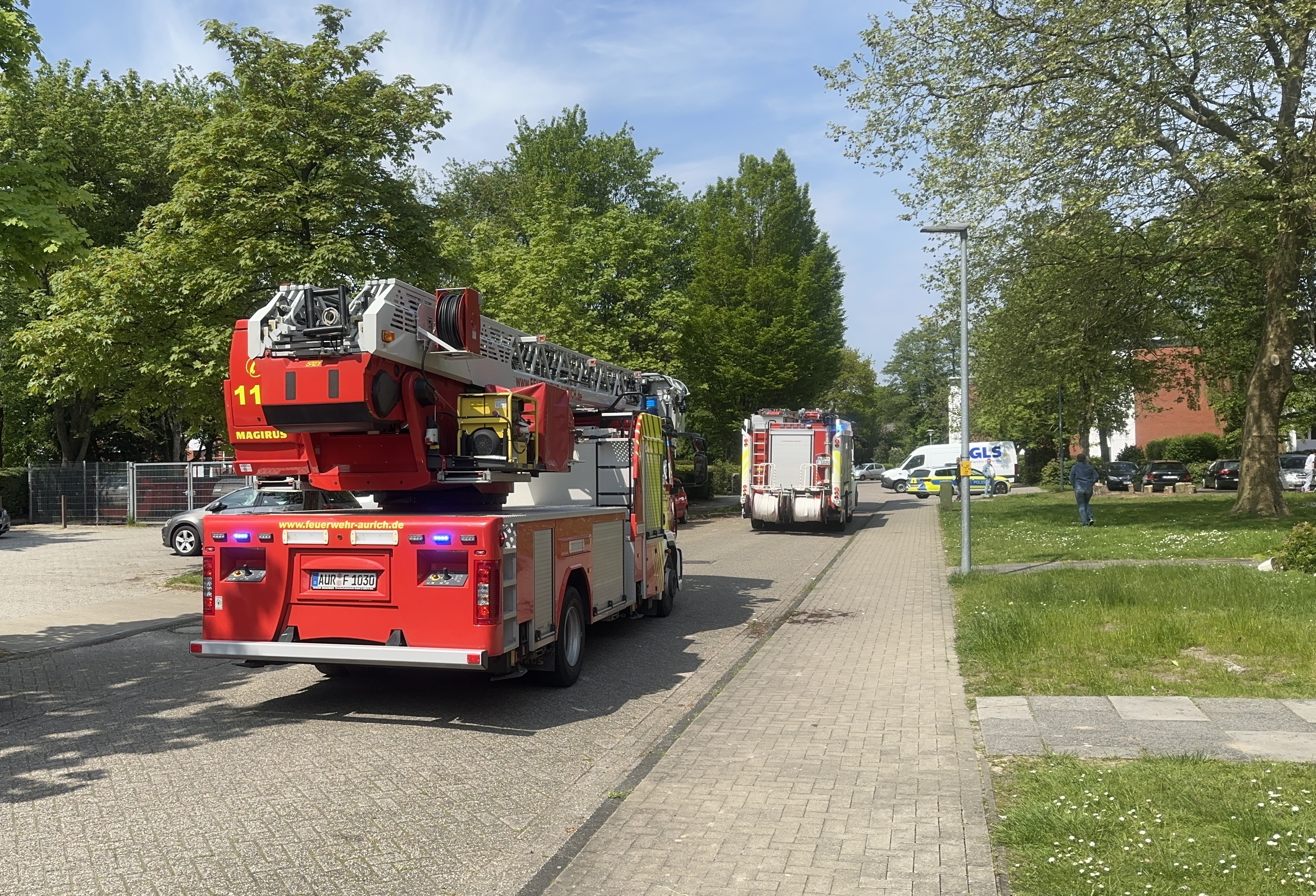 Ein Feuer auf dem Balkon eines Mehrparteienhauses in der Von-Bodelschwingh-Straße hat am Montagmittag zahlreiche Rettungskräfte in Bewegung gesetzt. Anwohner hatten den Brandgeruch bemerkt und daraufhin einen Notruf abgesetzt. Die aufgrund des Alarmstichwortes „Gebäudebrand“ unter anderem mit der Sirene alarmierten Einsatzkräfte der Feuerwehr Aurich rückten binnen weniger Minuten mit mehreren Fahrzeugen aus, konnten vor Ort aber schnell Entwarnung geben. Der Brand war beim Eintreffen bereits vollständig durch Nachbarn gelöscht worden und stellte somit keine Gefahr mehr dar. Auch Nachlöscharbeiten oder Lüftungsmaßnahmen waren nicht erforderlich. Während noch anrückende Kräfte ihre Anfahrt abbrechen konnten, wurde die Einsatzstelle nach gut 15 Minuten an die Polizei übergeben.