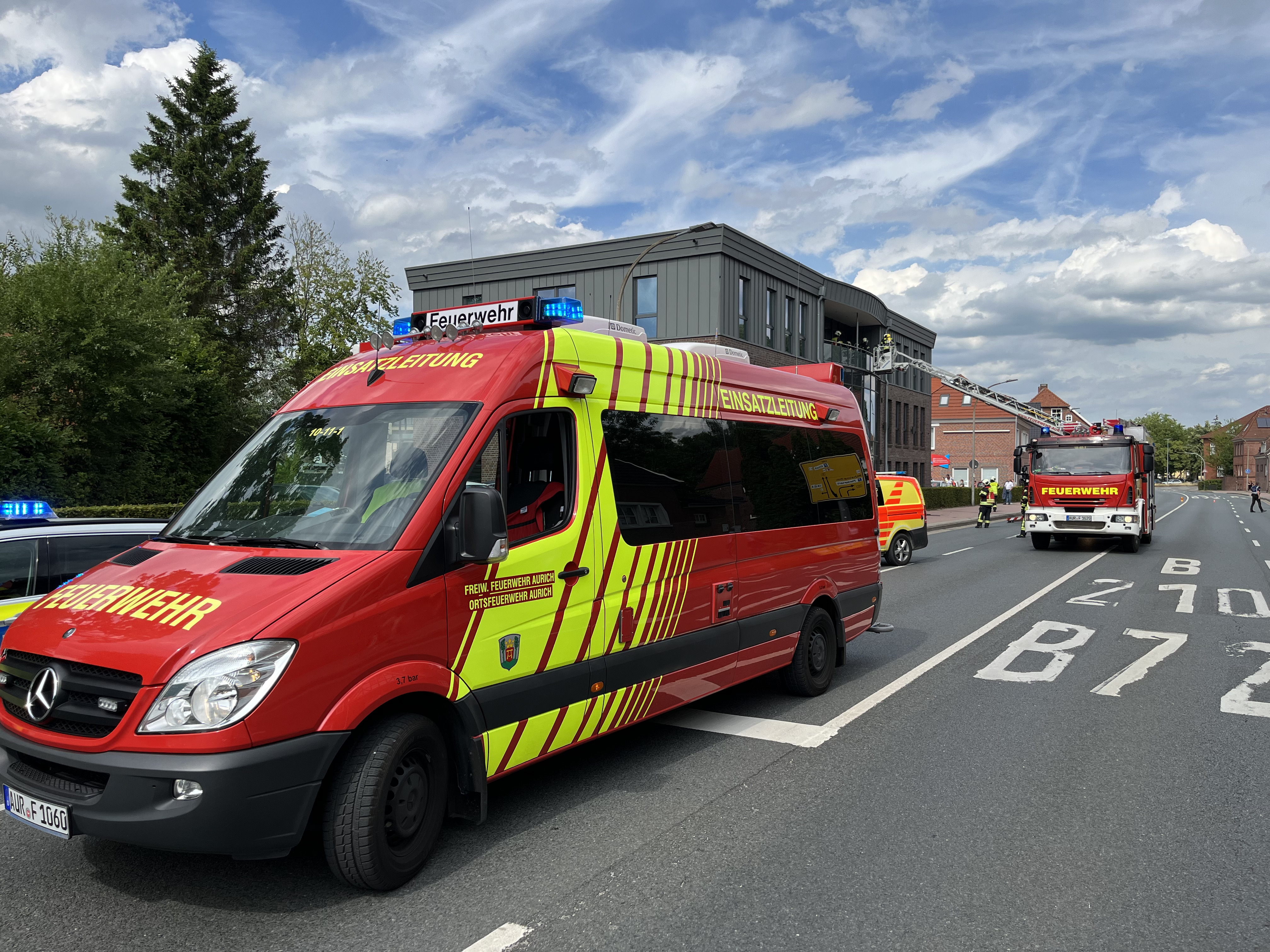Großalarm in den Nachmittagsstunden: Gegen 15:45 Uhr wurde ein Feuer innerhalb eines größeren Wohn- und Geschäftsgebäudes an der Von-Jhering-Straße im Auricher Stadtzentrum gemeldet. Da nicht ausgeschlossen werden konnte, dass sich noch Personen in dem Gebäudekomplex aufhalten, gab die Kooperative Regionalleitstelle Ostfriesland das Alarmstichwort „Feuer mit Menschenleben in Gefahr“ aus, woraufhin neben der unter anderem mit der Sirene alarmierten Feuerwehr Aurich und dem bei der Feuerwehr Middels stationierten Einsatzleitwagen 2 des Landkreises auch mehrere Einheiten von Rettungsdienst und Deutschen Roten Kreuz sowie der Polizei auf den Plan gerufen wurden.Die tatsächliche Lage konnte durch die Einsatzkräfte glücklicherweise bereits kurz nach Eintreffen entschärft werden: Tatsächlich war es zu einem kleineren Brand auf einem Balkon im zweiten Obergeschoss gekommen, welcher aber bereits größtenteils durch Anwohner gelöscht worden war. Die Feuerwehrleute kontrollierten die Schadenstelle mit der Wärmebildkamera und führten geringfügige Nachlöscharbeiten durch. Im Rahmen dieser wurden auch Teile des Balkonbodens ausgebaut und über die Drehleiter aus dem betroffenen Bereich entfernt. Anschließend kam ein Hochdrucklüfter zum Einsatz, um den teilweise ins Gebäudeinnere gezogenen Rauch aus den Räumlichkeiten zu entfernen.