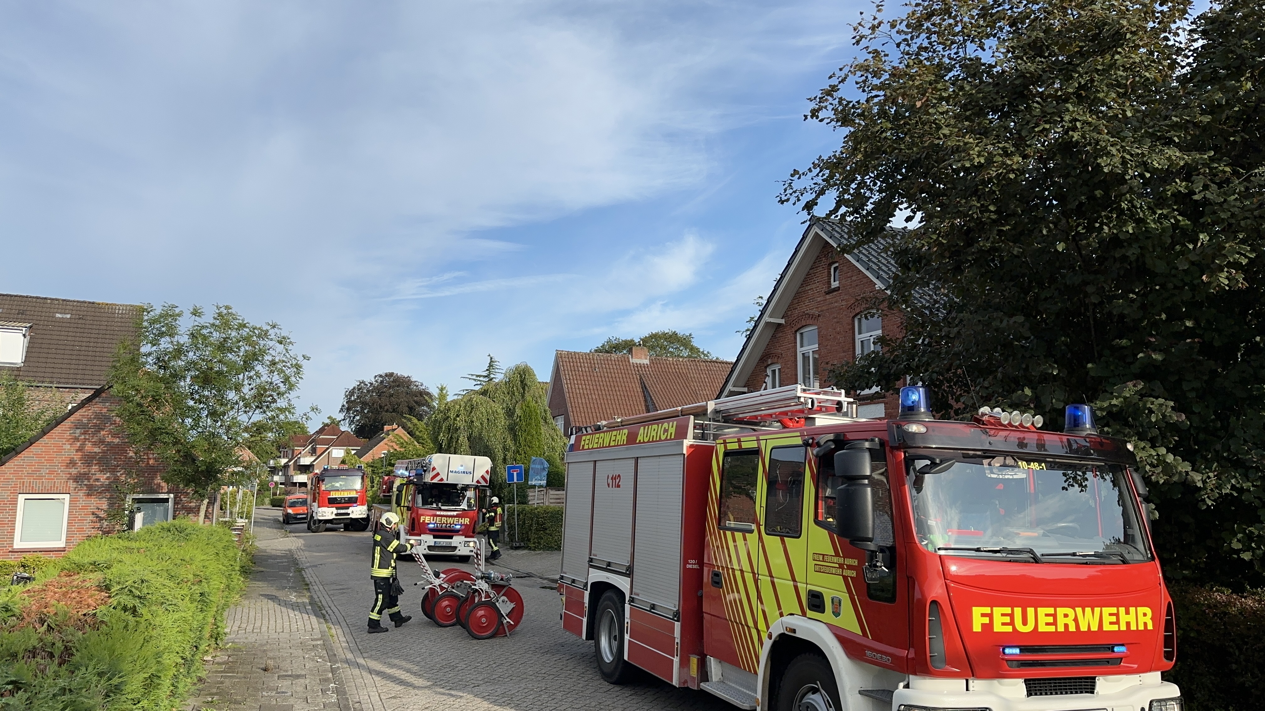 Wer am Samstagmorgen schon früh in Aurich auf den Beinen war, wird sich mitunter über die Einsatzfahrzeuge der Feuerwehr gewundert haben, die binnen weniger Minuten mit Sondersignal quer durch die Stadt fuhren. Das Ganze hatte jedoch einen erstzunehmenden Hintergrund: Um 07:20 Uhr war die Feuerwehr Aurich zu einem ausgelösten Heimrauchmelder innerhalb eines Mehrfamilienhauses im Amselweg alarmiert worden. Als die Feuerwehrleute die Einsatzstelle erreichten, konnten sie jedoch weder die angegebene Hausnummer finden, noch einen Piepton oder ein anderes Warnsignal wahrnehmen. Eine kurze Nachfrage über die Leitstelle, die im Hintergrund das erneute Gespräch zum Notrufenden suchte, ergab dann, dass der gemeldete Einsatzort nicht im Amselweg, sondern der Andreaestraße lag, welche umgehend durch die Fahrzeuge angefahren wurde.