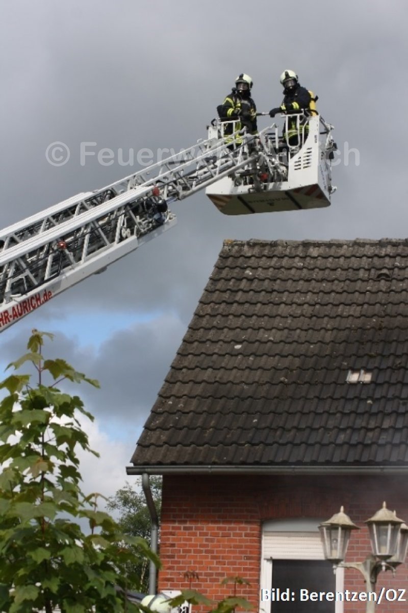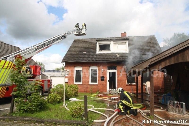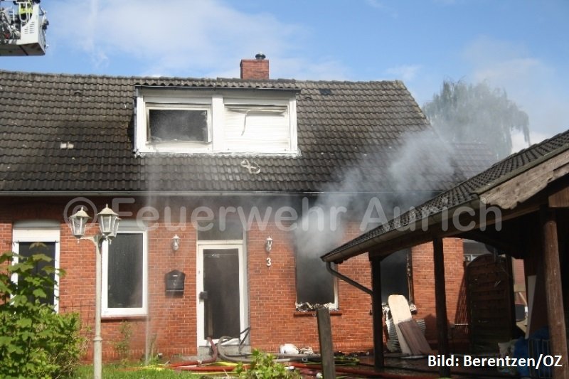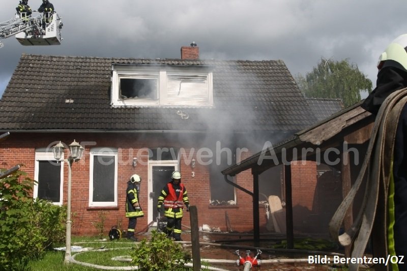 Die Ortsfeuerwehr Aurich und das DRK Aurich wurden mit dem Einsatzstichwort „Feuer, groß“ gegen 16:00 Uhr alarmiert. Bei dem Gebäude handelte es sich um zwei Einfamilienhäuser, die über einen Zwischenbau miteinander verbunden waren. Der Zwischenbau sollte sich später als ein enormes Hindernis darstellen. Für die ersten Einsatzkräfte des ELW, des HLF und der DLK stellte sich die Situation zu Beginn so dar, dass der brennende Gebäudeteil vollständig geräumt war, da er sich zum Zeitpunkt des Brandes in der Renovierung befand. Während sich die Flammen in einem Zimmer im Erdgeschoss vollständig ausgebreitet hatten, war der heiße Brandrauch schon im gesamten Gebäude bis in die Dachspitze verteilt.