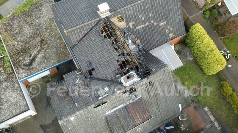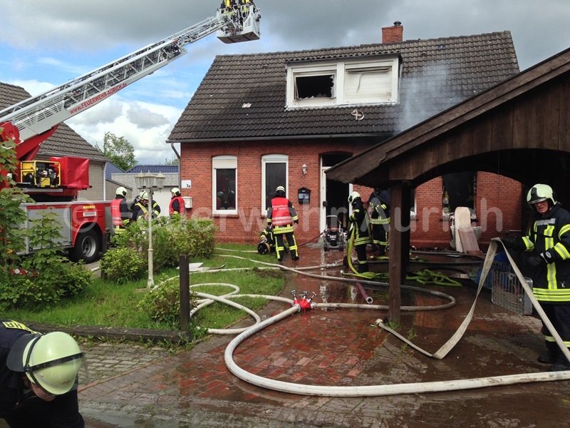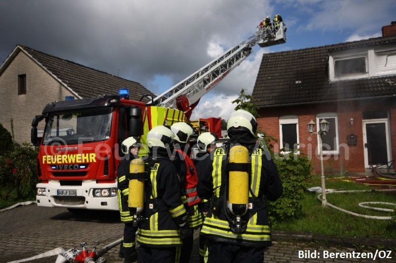 Die ersten beiden Atemschutztrupps des HLF bekämpften das Feuer im Erdgeschoss und durchsuchten mit der Wärmebildkamera das Obergeschoss nach Brandstellen, da auch Rauch aus den obersten Dachziegeln drang. Die Besatzung der Drehleiter öffnete das Dach, damit der heiße Brandrauch entweichen konnte. Die Löschmaßnahmen beschränkten sich bis zu diesem Zeitpunkt auf 2 C-Rohre im Innenangriff. Das Feuer hatte sich jedoch zwischenzeitlich seinen Weg unter die Dachhaut im Bereich des Zwischenbaus gesucht. Da diese Verbindung zwischen den beiden Einfamilienhäusern nur eingeschränkt begehbar war, blieb den Einsatzkräften nur das Entfernen aller Dachziegel des Zwischenbaues von außen übrig, um an das Feuer zu gelangen. Da die Atemschutzgeräteträger an der Einsatzstelle knapp wurden, bzw. entkräftet waren, entschied die Einsatzleitung, das LF 8 der Ortsfeuerwehr Wallinghausen zu alarmieren.