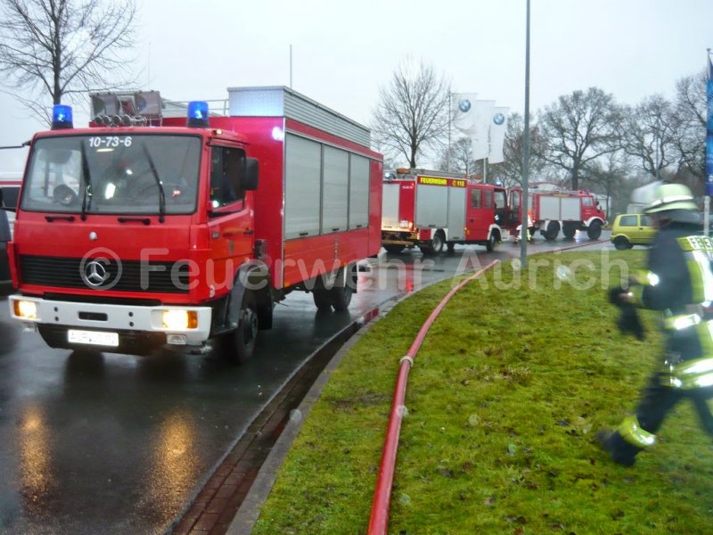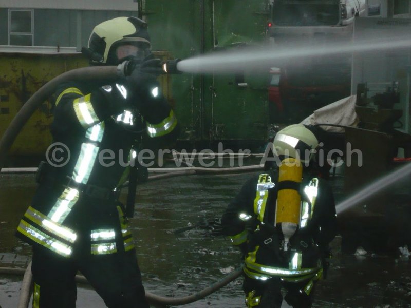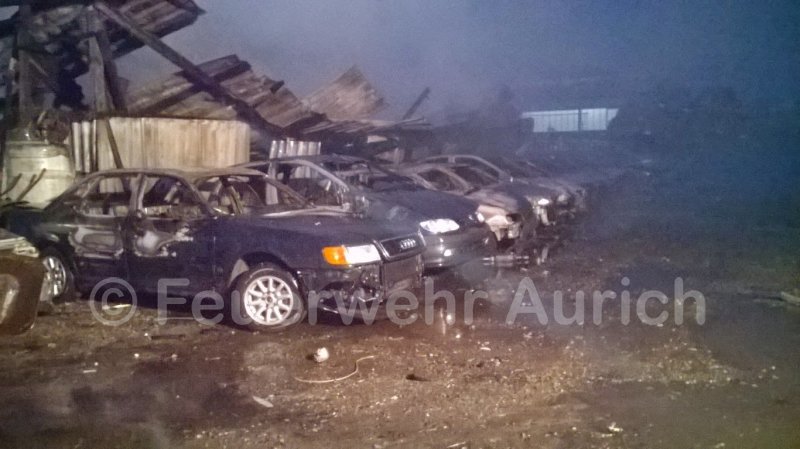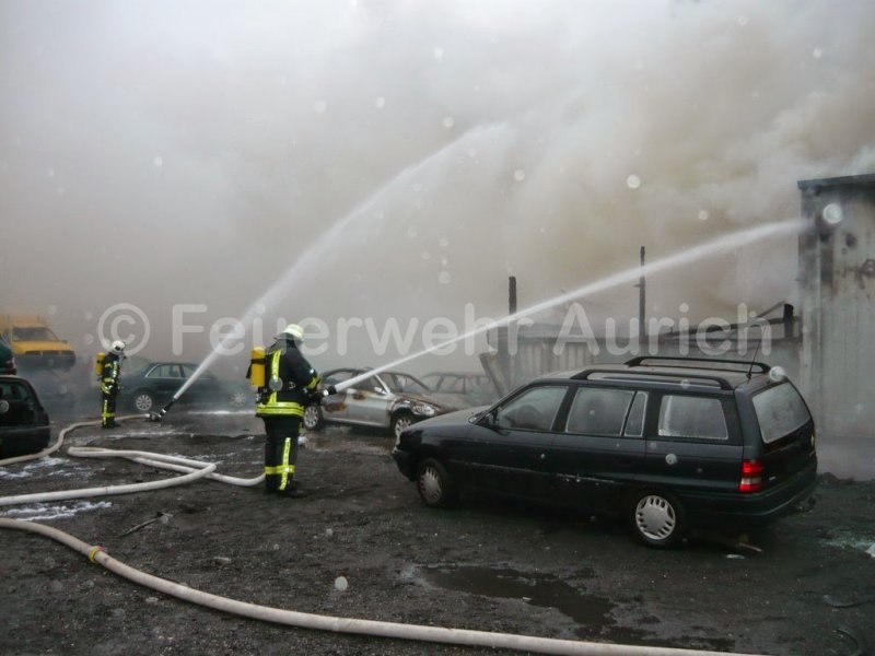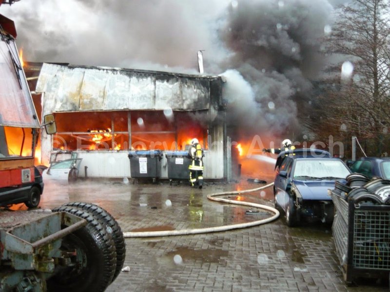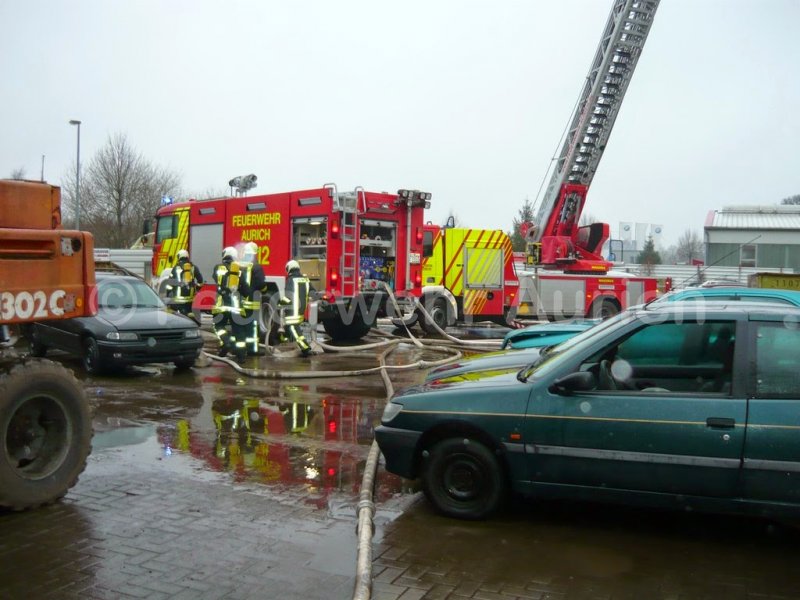 Die Ortsfeuerwehr Aurich wurde gegen 15 Uhr mit dem Einsatzstichwort „Feuer, Betriebsgebäude“ zu einer Halle alarmiert, in der Pkw entsorgt wurden. Gemäß Ausrückeordnung bedeutet dies Vollalarm für alle Auricher Fahrzeuge und den Einsatzleitwagen 2 aus Middels. Bei dem Eintreffen der ersten Einsatzkräfte brannte die 20 x 30 m große Halle bereits im Vollbrand. Ein Innenangriff war aufgrund der hohen Temperaturen und der Einsturzgefahr nicht mehr möglich.