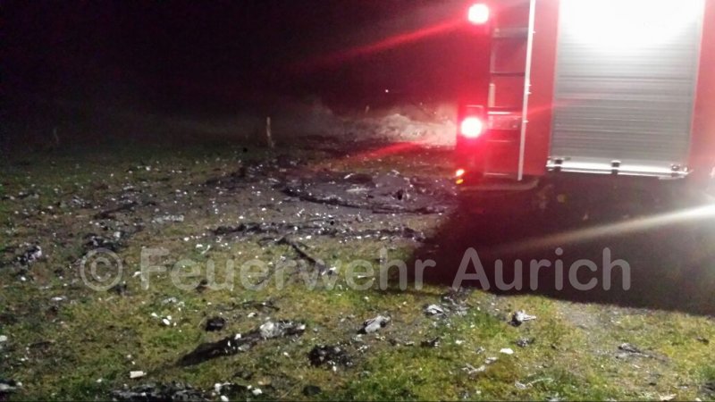 Das HLF wurde gegen 4 Uhr wieder zum Feuerwehrhaus nach Aurich zurückgeschickt. Die Mannschaft des TLF wartete ab, bis gegen 05:00 Uhr keine herabstürzenden Teile der Anlage mehr zu sehen waren und löschte dann unter Atemschutz die am Boden liegenden Reste mit Schaum ab.