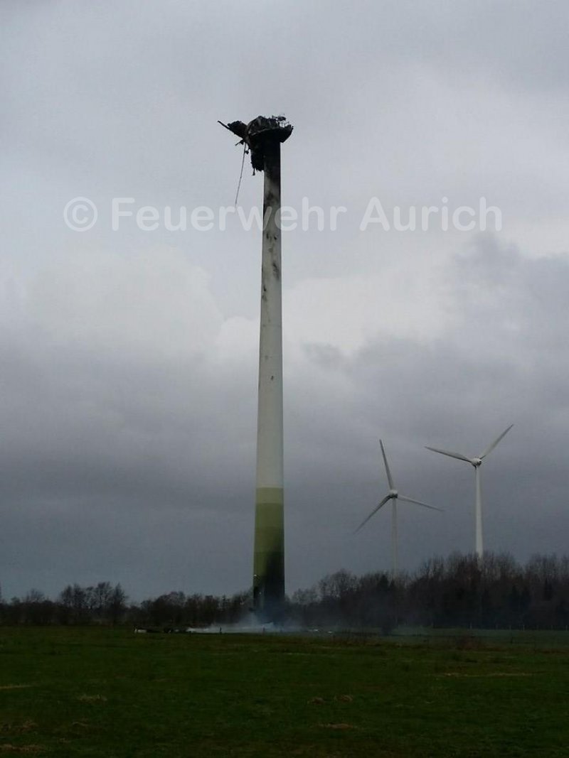 Der ELW, das HLF, die Ortsfeuerwehr Wallinghausen und kurze Zeit später auch das TLF Aurich machten sich auf den Weg nach Pfalzdorf. Die Einsatzstelle war verständlicherweise schon aus großer Entfernung zu sehen. Das Maschinenhaus in einer Höhe von ca. 60 m und die Rotorblätter standen bereits im Vollbrand. Nach ungefähr 60 Minuten waren die drei Rotorblätter brennend zu Boden gefallen.