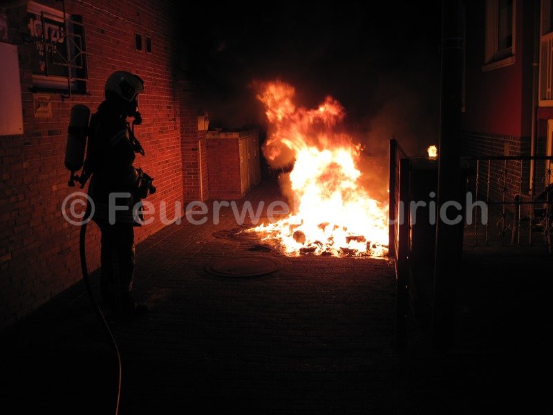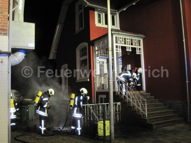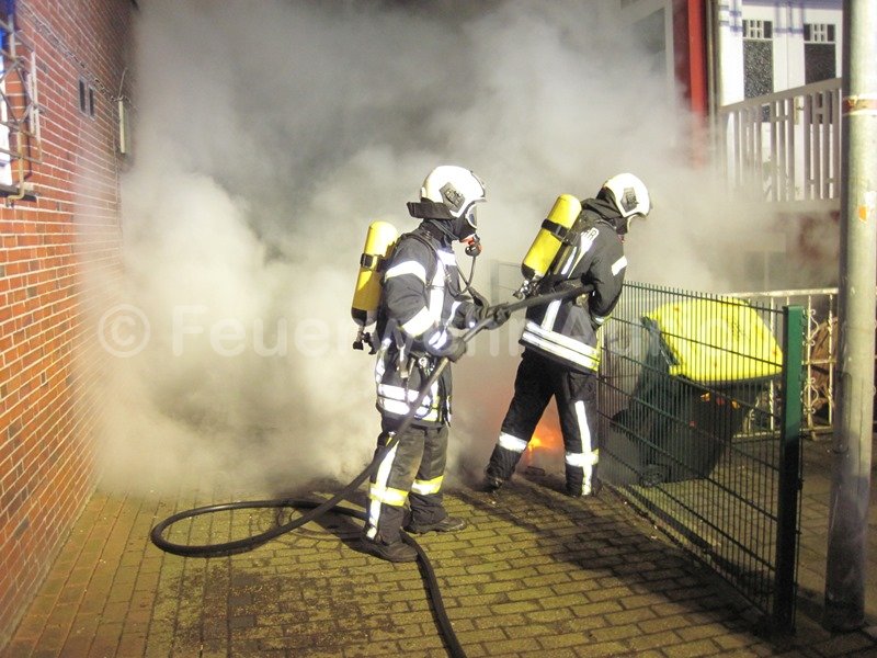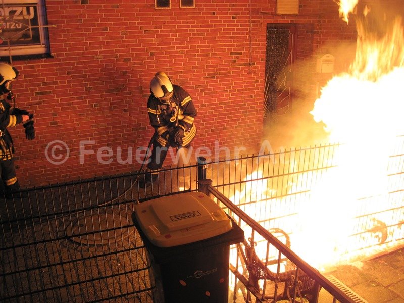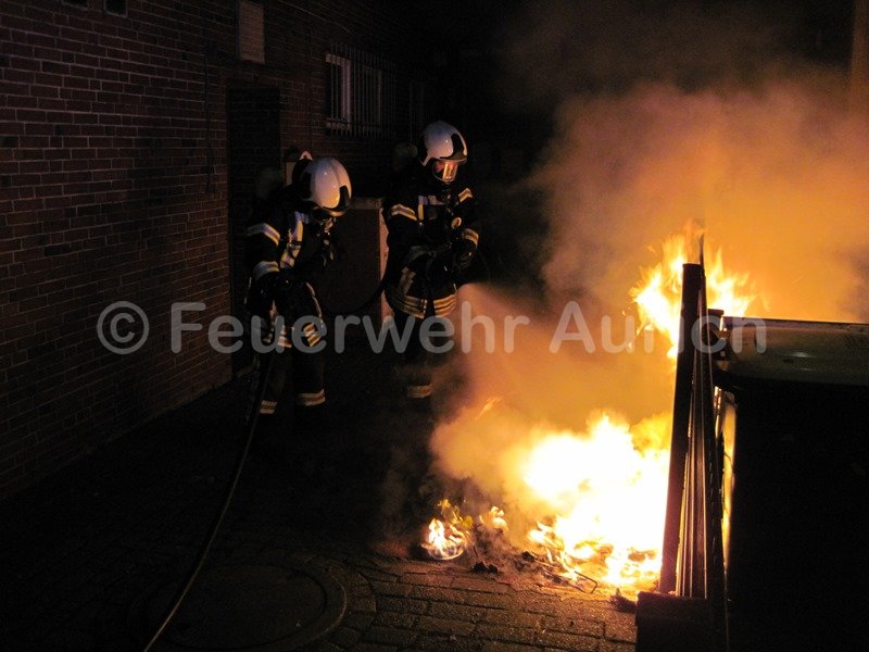 Beim Eintreffen der Einsatzkräfte brannten mehrere Kunststoffabfallbehälter in einem schmalen Durchgang zur Rudolf-Eucken-Allee. Das Feuer konnte von den elf Kameraden zügig gelöscht werden. Das Treppenhaus eines angrenzenden Wohngebäudes, in das durch ein offenstehendes Fenster Rauchgase gedrungen waren, wurde durch die Feuerwehr belüftet. Die Bewohner wurden frühzeitig von den Einsatzkräften geweckt.