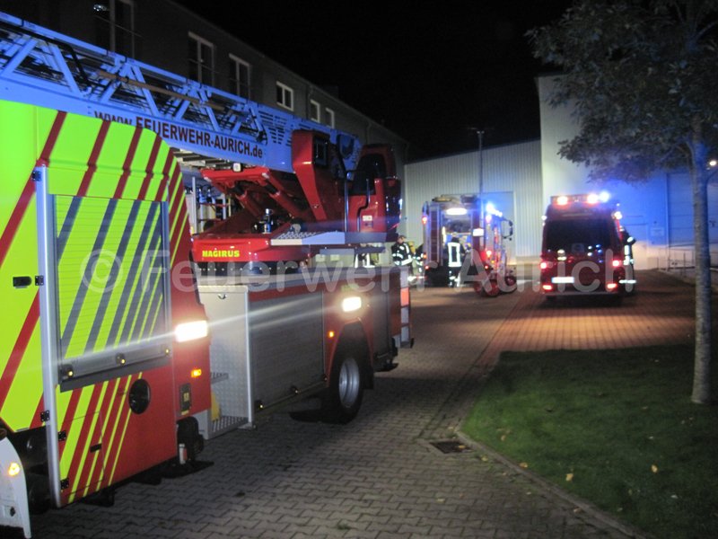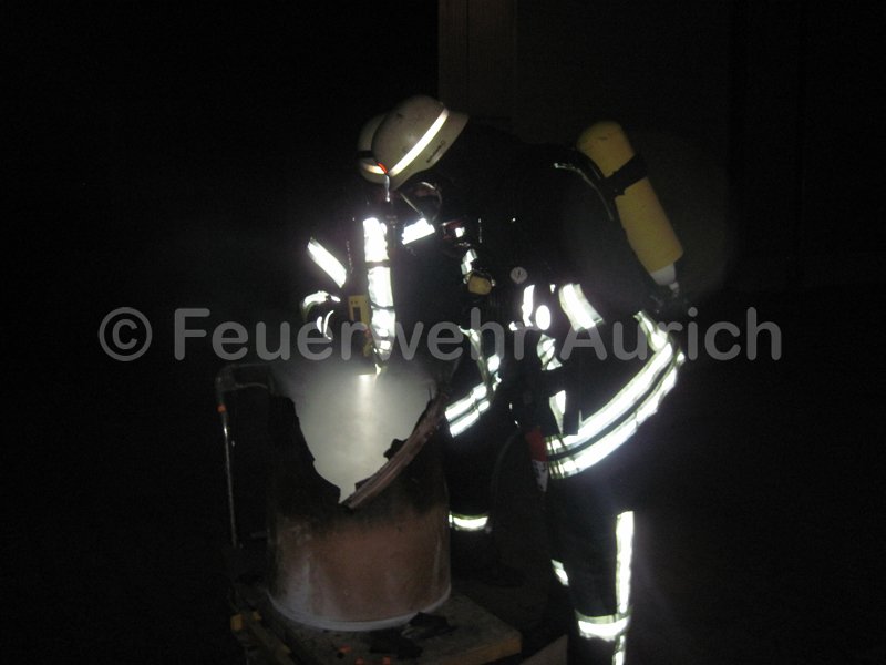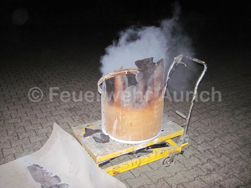 Am Donnerstagmorgen wurde die Feuerwehr Aurich zu einer ausgelösten Brandmeldeanlage in einem Chemiebetrieb im Industriegebiet Schirum gerufen. Beim Eintreffen der ersten Kräfte zeigte die Brandmeldeanlage einen ausgelösten Melder in einer der Produktionshallen. Bei der ersten Erkundung durch den Einsatzleiter und den Gruppenführer des Hilfeleistungslöschgruppenfahrzeuges war Brandgeruch in der ersten Halle wahrnehmbar. In der nächsten Halle wurde dann offenes Feuer festgestellt. Sofort wurde eine Alarmgruppenerhöhung auf Großbrand veranlasst und ein Atemschutztrupp zur weiteren Erkundung und Brandbekämpfung vorgeschickt. Die Erkundung durch den Angriffstrupp ergab, dass es in einer, aus brennbaren Materialien bestehenden, Abfalltonne brannte. Die Flammen stiegen schon über einen Meter aus der Tonne empor. Das Feuer wurde umgehend mit einem Pulverlöscher abgelöscht und die Tonne auf einem Rollwagen ins Freie gebracht. Außerhalb des Gebäudes wurde das noch qualmende Material mit dem Schnellangriffsschlauch vom LF 10/6 abgelöscht. Anschließend wurde die Brandstelle mit der Wärmebildkamera kontrolliert um versteckte Glutnester oder Beeinträchtigungen der Chemieprodukte auszuschließen. Im weiteren Verlauf wurden die Hallen mit einem Hochleistungslüfter vom Brandrauch befreit. Durch die schnelle Entdeckung des Feuers und das schnelle und umsichtige Eingreifen der Feuerwehr konnte ein Schaden am Gebäude und Produktionsgütern gänzlich verhindert werden.