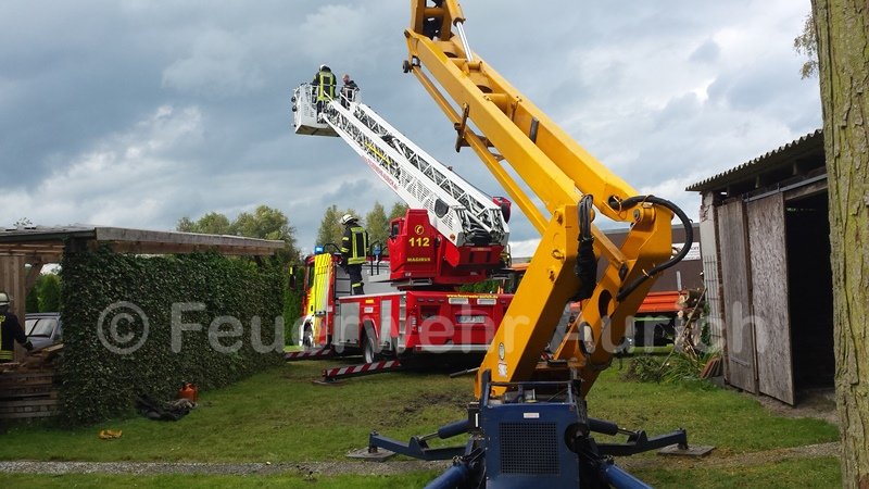 Tatsächlich war die Technik eines Hubsteigers ausgefallen, während eine Person sich im Korb des Arbeitsgerätes in etwa 10 m Höhe befand. Durch den Ausfall der Hydraulik hatte der Korb bereits eine kräftige Schieflage erreicht.
