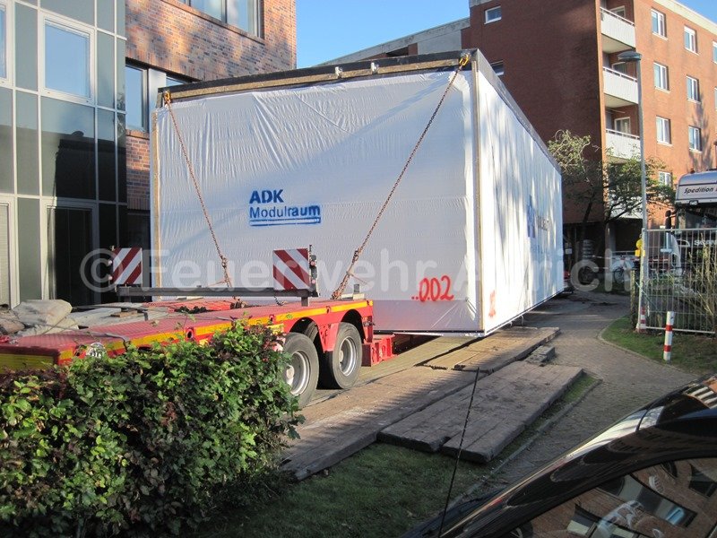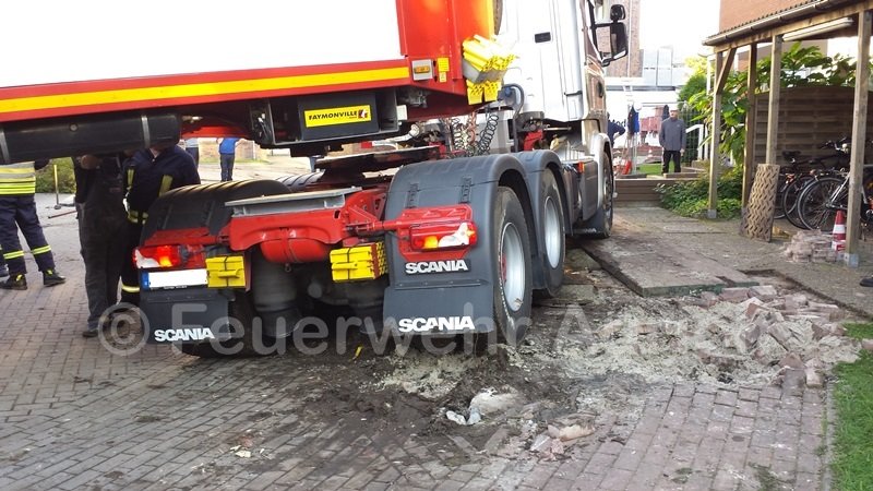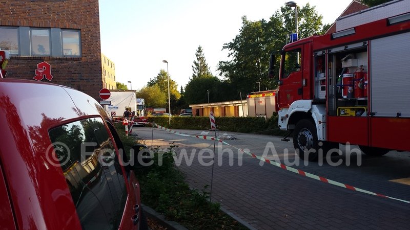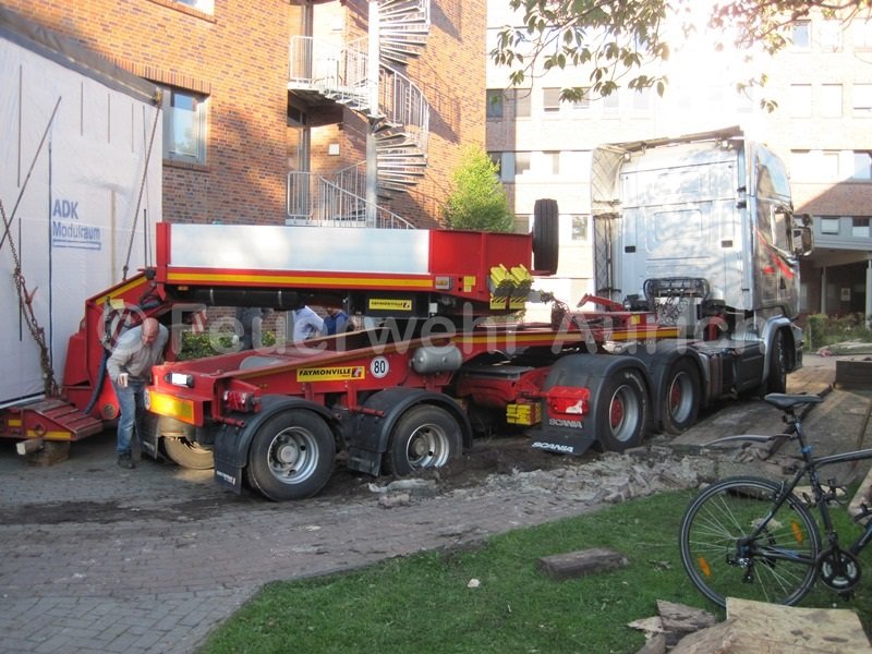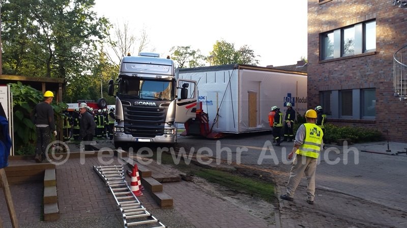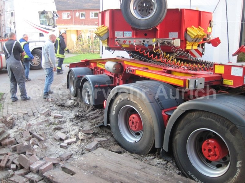 Auf dem Gelände der UEK Aurich finden zur Zeit Bauarbeiten anlässlich der Errichtung zweier Linksherzkathetermessplätze statt. Während der Anlieferung eines Containers musste der Fahrer der Zugmaschine die befestigte Straße aufgrund des großen notwendigen Wenderaduis verlassen. Dabei sackte die Zugmaschine im weichen Untergrund ein. Der gesamte Zug hatte ein Gewicht von 68 Tonnen.