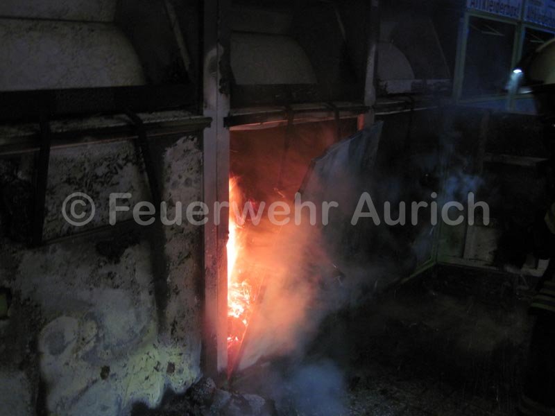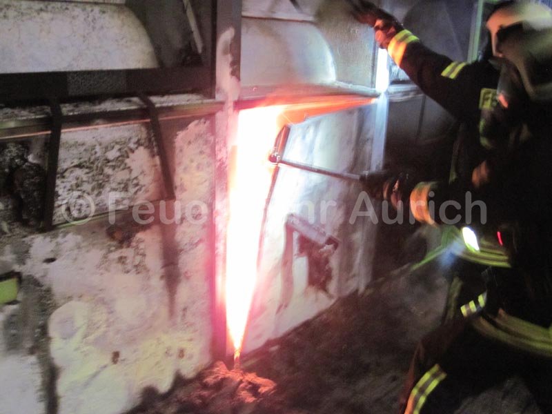 In der Nacht von Freitag auf Samstag wurde die Ortsfeuerwehr Aurich gegen halb 4 zu einem Parkplatz am Pferdemarkt gerufen. Dort brannten mehrere Altkleidercontainer, die auf dem Parkplatz aufgestellt waren. Die brennenden Container wurden mit einem Trennschleifer geöffnet und der Inhalt abgelöscht. Dazu wurden zwei Trupps unter schwerem Atemschutz mit einem Schnellangriff eingesetzt. Nach ca. 80 Minuten waren alle Container geöffnet und abgelöscht.