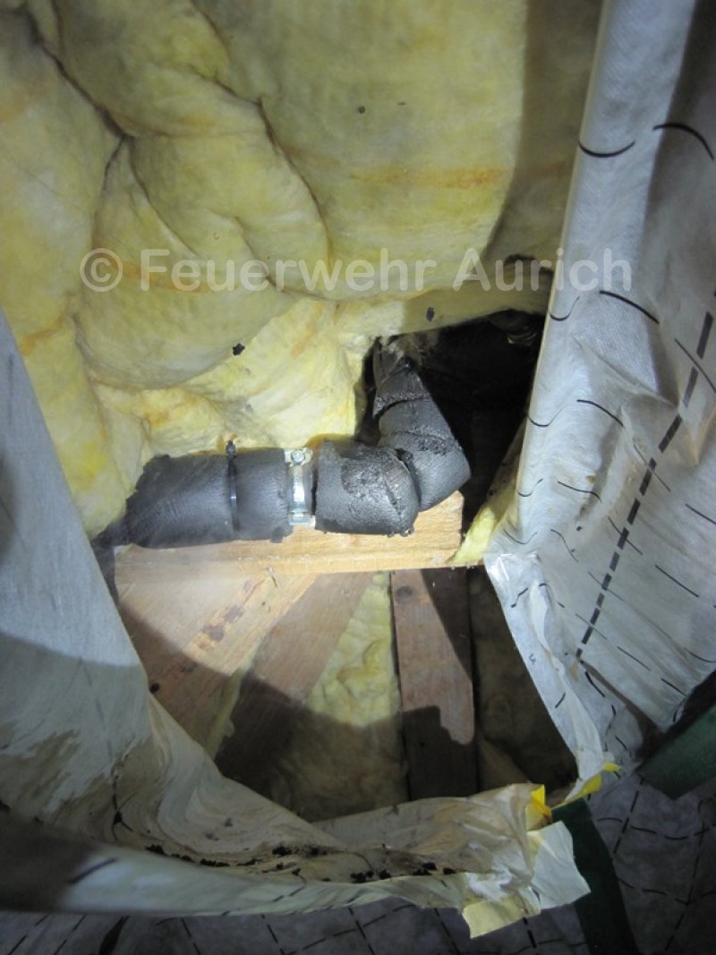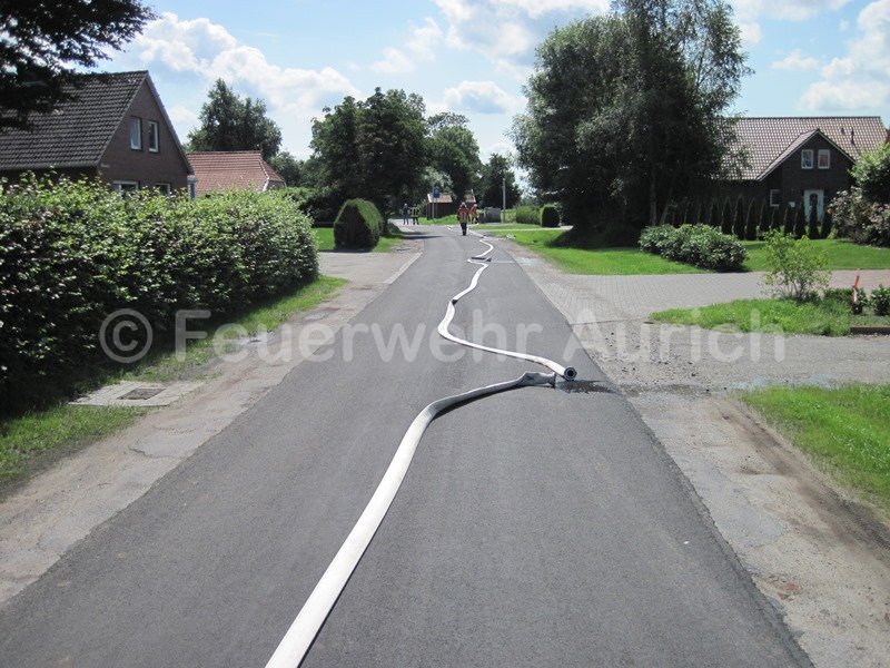 Die Ortsfeuerwehr Aurich und die DRK Bereitschaft Aurich wurden am Mittag zur Unterstützung der Ortsfeuerwehr Haxtum alarmiert. Anfangs rückte man mit der Drehleiter und dem ELW (samt Wärmebildkamera) zur Einsatzstelle aus. Anrufer meldeten Rauch aus einem Dachstuhl. Der erste Eindruck bestätigte diese Meldung, was zusätzlich zu den beiden Haxtumer Löschfahrzeugen die Nachforderung des Auricher HLF zur Folge hatte. Während der Einsatzleiter die Einsatzstelle von innen erkundete, wurden Löschangriffe über die DLK und als Innenangriff vorbereitet. Zahlreiche Atemschutztrupps standen ebenfalls bereit. Nach schweißtreibender Entfernung des Dämmmaterials auf dem Dachboden stellte sich der Rauch als Wasserdampf aus einem Überdruckventil der Solaranlage dar. Die Heißwasserleitung wurde entlang des Firstes über das Dach geführt. Alle vorbereitenden Maßnahmen konnten abgebrochen werden. Ab jetzt war dieser Einsatz ein Fall für einen Heizungsfachmann.