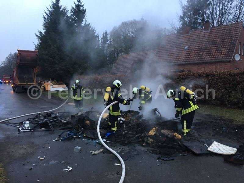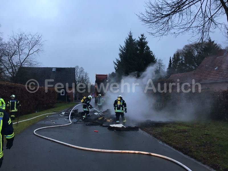 Die Ortsfeuerwehren Walle und das HLF Aurich wurden zu einem brennenden Sperrmüllhaufen nach Walle gerufen. Der Fahrer eines Lkw hatte es noch rechtzeitig geschafft, seine brennende Ladung auf die Straße zu kippen, sodass ein Schaden an dem Fahrzeug verhindert werden konnte. Da die Flammen durch den starken Wind in Richtung eines Wohngebäudes gedrückt wurden und dadurch eine Ausdehnung des Brandes drohte, rückte das einsatzbereite TLF Aurich ebenfalls aus.