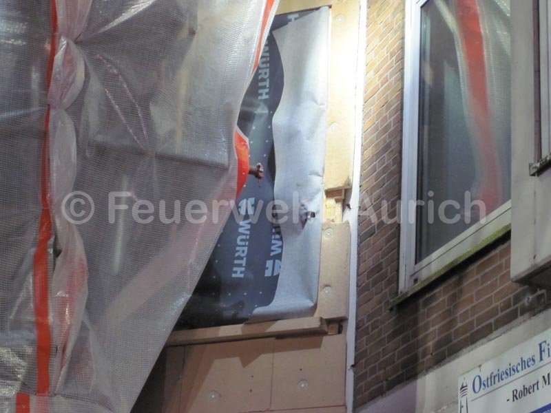 Das Baugerüst war mit einer Schutzfolie und Werbebanner behangen. Diese wirkten wie ein riesiges Segel. Durch den starken Wind wurde ein Maueranker aus der Wand gerissen und das Gerüst begann bei jedem Windstoß gefährlich zu wackeln.