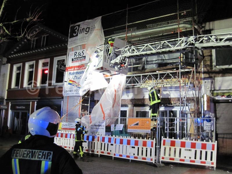 Als erste Maßnahme wurde das Gerüst mittels Leinen am Gebäude gesichert. Anschließend wurden die Folie und die Werbeschilder entfernt um dem Wind die Angriffsfläche zu nehmen. Zu guter letzt wurde der Bereich um das Gerüst weiträumig abgesperrt.