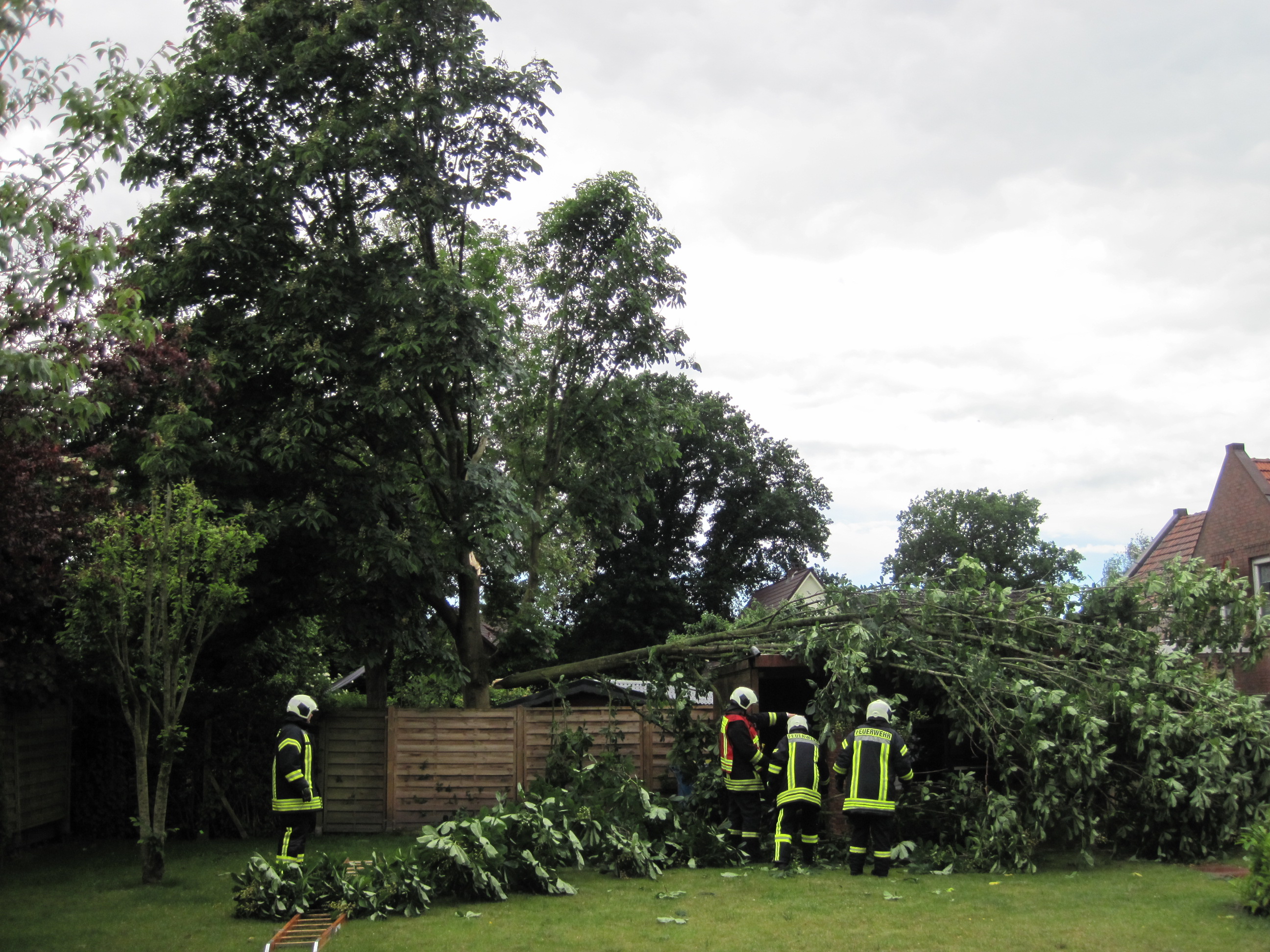 Laut der Notrufmeldung drohte aufgrund der Wetterlage ein Baum auf ein Haus zu stürzen, vor Ort stellte sich heraus, dass ein größerer Ast bereits auf einen Geräteschuppen gestürzt ist.