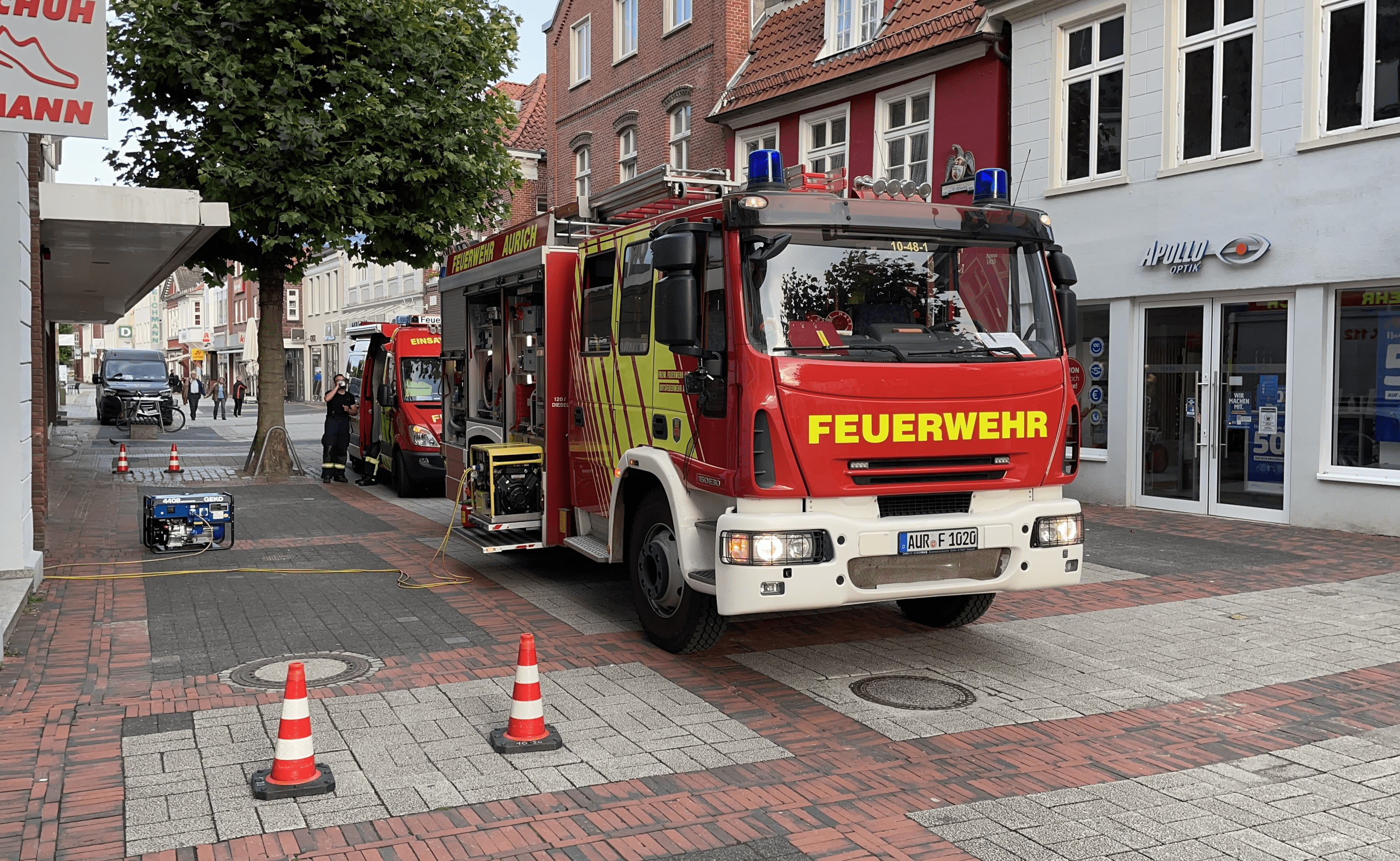 In einem Geschäftshaus in der Auricher Innenstadt kam es am Freitagabend zu einem erheblichen Wasserschaden, welcher einen mehrere Stunden andauernden Einsatz der Feuerwehr Aurich nach sich zog.Der Hausmeister des Gebäudes entdeckte die Wassermengen innerhalb eines Schachtes im Kellergeschoss, woraufhin er die Feuerwehr hinzuzog. Da nicht auszuschließen war, dass das Wasser unkontrolliert in weitere Bereiche des Kellers fließt und dort erhebliche Schäden verursacht, nahmen die Einsatzkräfte insgesamt drei Hochleistungs-Schmutzwasserpumpen in Betrieb, um das Wasser aus dem Schacht zu befördern. Aus dem Kellergeschoss heraus wurden 120 Meter Schlauchleitung bis zur nächstgelegenen Oberflächenentwässerung verlegt, durch die das geförderte Wasser kontrolliert ablaufen konnte.