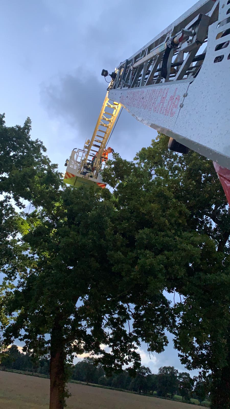 In Folge eines stärkeren Gewitters kam es im Auricher Ortsteil Tannenhausen zu vereinzelten Sturmschäden. Unter anderem drohten mehrere Äste aus Baumkronen abzubrechen. Die zunächst alarmierte Feuerwehr Tannenhausen stellte vor Ort fest, dass die Unterstützung der Drehleiter aus Aurich notwendig war, um die beiden Bäume sicher beschneiden zu können. Über den Korb der Drehleiter wurden die notwendigen Arbeiten in der Folge durchgeführt und die Gefahr schlussendlich mit vereinten Kräften beseitigt.