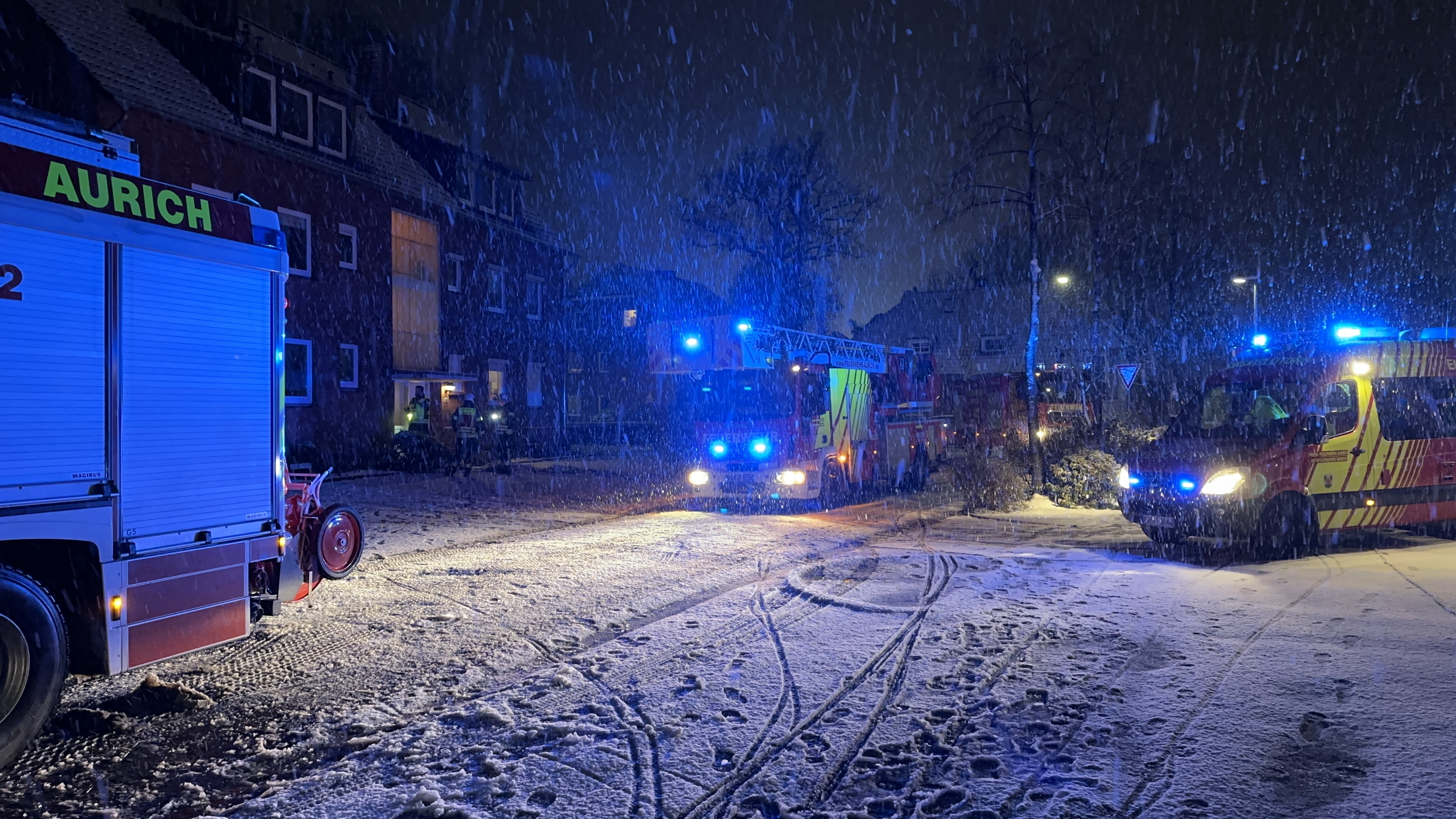 Gleich zweimal binnen zwei Stunden musste die Feuerwehr Aurich am Freitagabend im regen Schneetreiben ausrücken. Zunächst nahm eine Anwohnerin das Piepen eines Rauchmelders aus einer Wohnung am Lüchtenburger Weg wahr. Es öffnete aber niemand die Tür, woraufhin die Frau folgerichtig den Notruf wählte. Die um 18:56 Uhr alarmierten Einsatzkräfte der Feuerwehr Aurich konnten nach ihrer Ankunft an der Einsatzstelle den Alarm schlagenden Heimrauchmelder ebenfalls deutlich wahrnehmen. Da jedoch von außerhalb der Wohnung keine konkreten Anzeichen für ein Feuer festgestellt werden konnten, wurde ein schadfreier Zugang geschaffen und die Vermutung eines Fehlalarms letztendlich bestätigt. Gut eine Stunde nach Alarmierung konnten die letzten Feuerwehrkräfte wieder einrücken. Ebenfalls waren die Polizei und der Rettungsdienst vor Ort.
