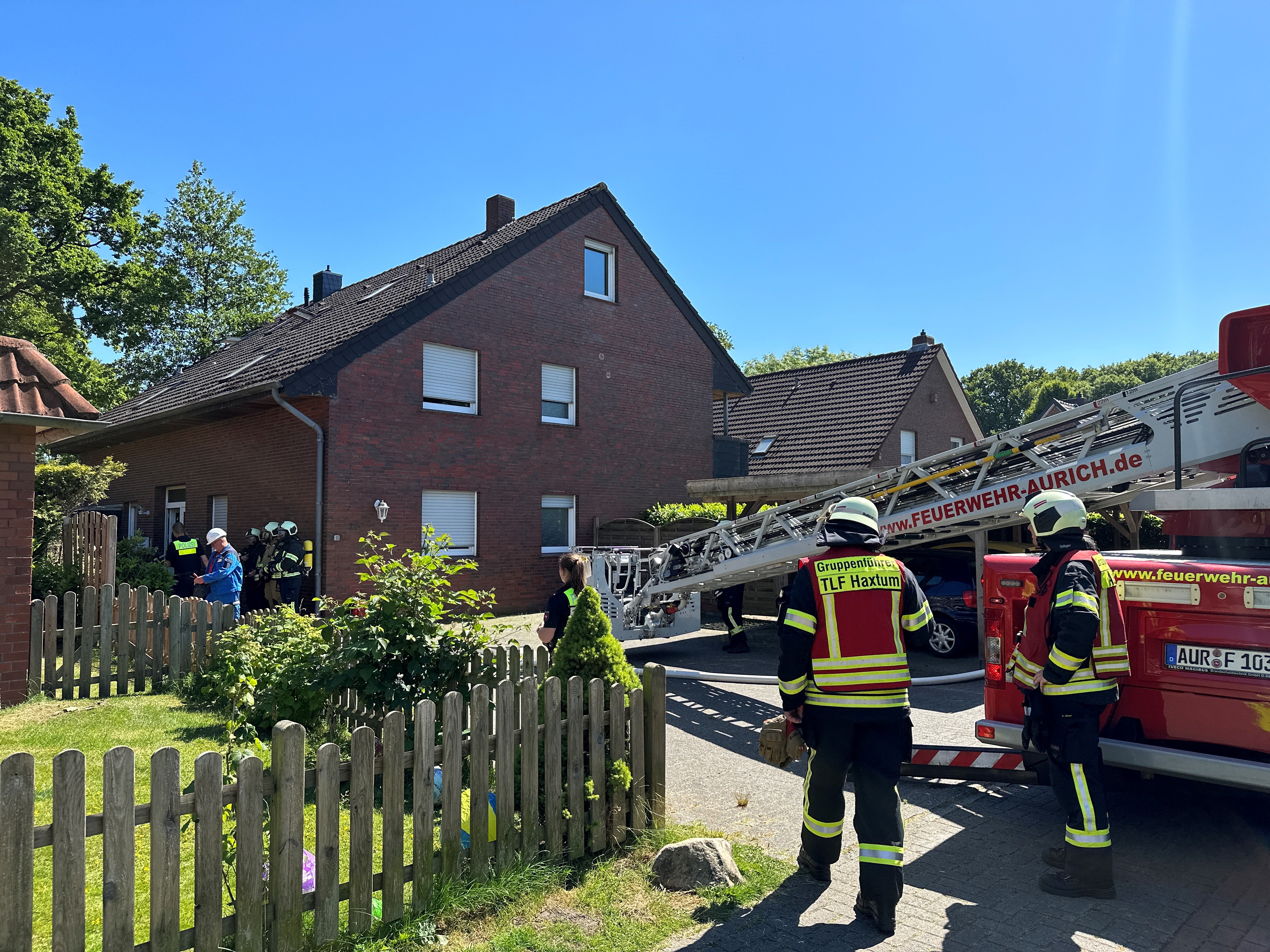 Ein Feuer im Bereich einer Küche hat am Samstagnachmittag großen Schaden innerhalb eines Mehrparteienhauses ausgelöst. Zuvor waren die Ortsfeuerwehren Haxtum und Aurich, der bei der Ortsfeuerwehr Middels stationierte Einsatzleitwagen des Landkreises und das Deutsche Rote Kreuz um 14:56 Uhr zu einem gemeldeten Dachstuhlbrand in die Rhododendronstraße nach Aurich-Haxtum alarmiert worden.Die ersteintreffenden Einsatzkräfte konnten bereits von außerhalb des Gebäudes eine Rauchentwicklung wahrnehmen und begaben sich sofort mit einem Trupp unter Atemschutz in den Innenangriff. Sie lokalisierten den Brandherd rasch in den Räumlichkeiten einer Küche der Dachgeschosswohnung und leiteten die Löscharbeiten ein. Da nicht sicher war, ob alle gemeldeten Bewohner rechtzeitig aus dem Haus gelangt waren, suchte ein weiterer Atemschutztrupp sämtliche Räume des Gebäudes ab. Zudem unterstützte ein dritter Trupp die Löschmaßnahmen.