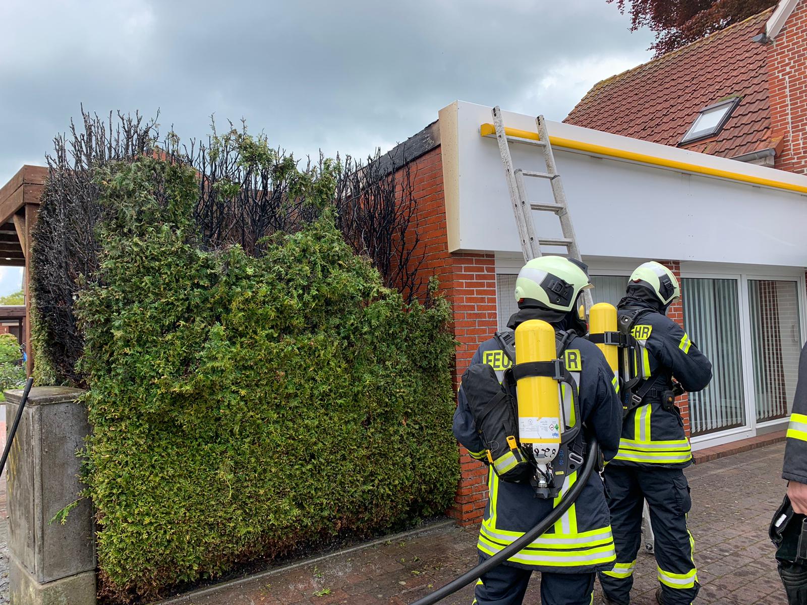 Binnen kürzester Zeit galt es für die Feuerwehr Aurich am Donnerstagmittag gleich zwei Einsätze abzuarbeiten. Zunächst kam es gegen 12:30 Uhr in der Lambertistraße zu einem Heckenbrand, welcher bei Ankunft der Einsatzkräfte bereits größtenteils durch einen Anwohner unter Zuhilfenahme eines Gartenschlauches abgelöscht worden war. Da die Hecke jedoch unmittelbar an eine Überdachung grenzte, wurde diese mittels Wärmebildkamera auf potenzielle Glutnester untersucht. Das schnelle Eingreifen des Anwohners hatte sich als sehr effektiv erwiesen, sodass der Einsatz bereits nach etwa 20 Minuten beendet werden konnte.