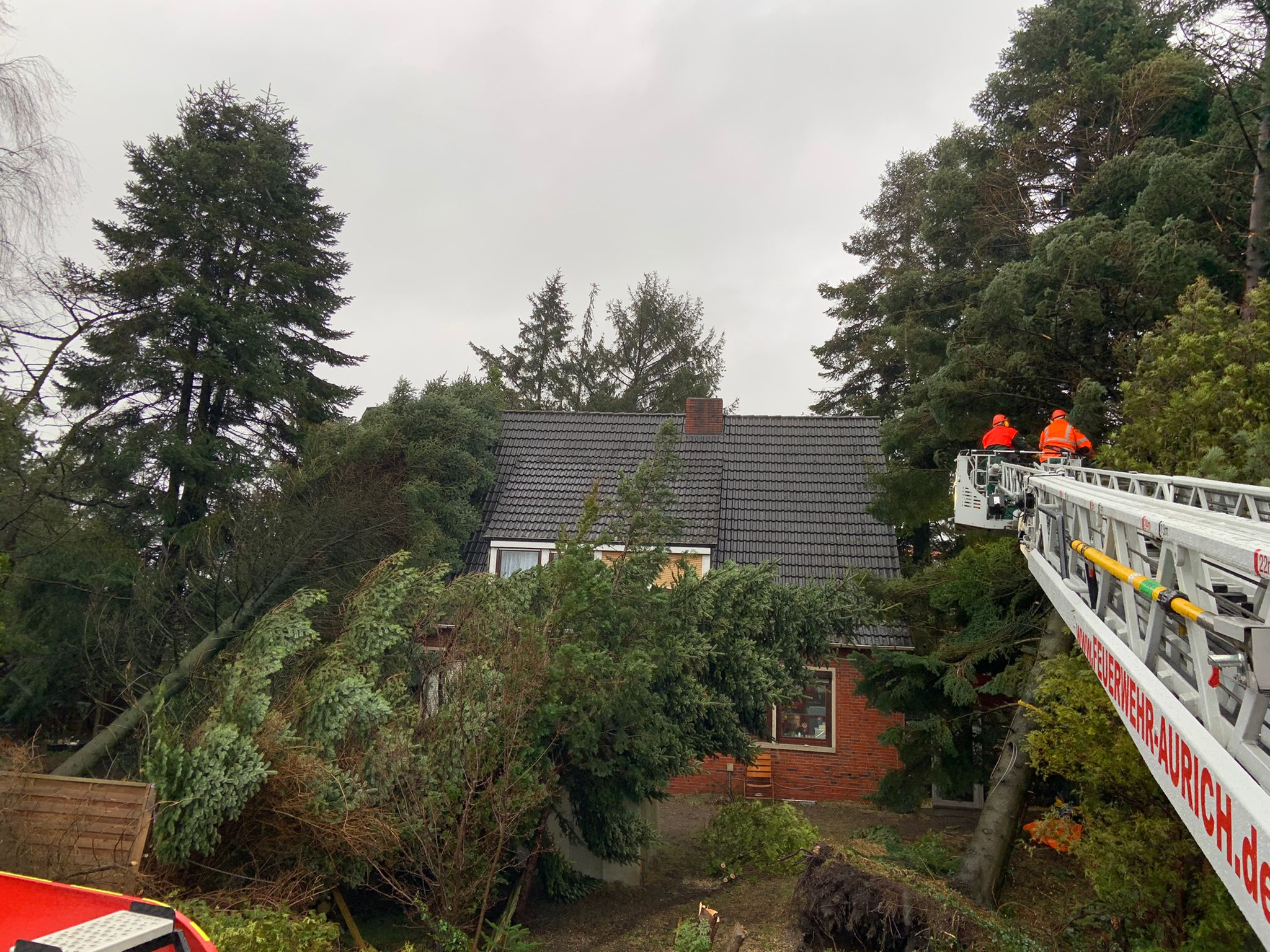 Eine weitere Auswirkung des Orkantiefs beschäftigte am Sonntagmittag die Feuerwehren Wiegboldsbur und Aurich. Ein größerer Baum drohte unmittelbar auf ein Wohnhaus zu stürzen und musste daher beseitigt werden. Dies realisierten die Einsatzkräfte über den Korb der Drehleiter, indem der Baum Stück für Stück abgetragen wurde. Mit der Wiederherstellung der Einsatzbereitschaft war der Einsatz gegen 15:30 Uhr beendet.