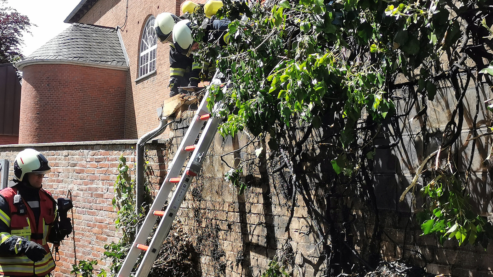 Vor Ort wurden 2 Trupps unter Atemschutz zur Brandbekämpfung eingesetzt. Das Efeu, welches an dem Gebäude wuchs, musste komplett entfernt werden um die letzten Glutnester in der Decke des Anbaus abzulöschen.