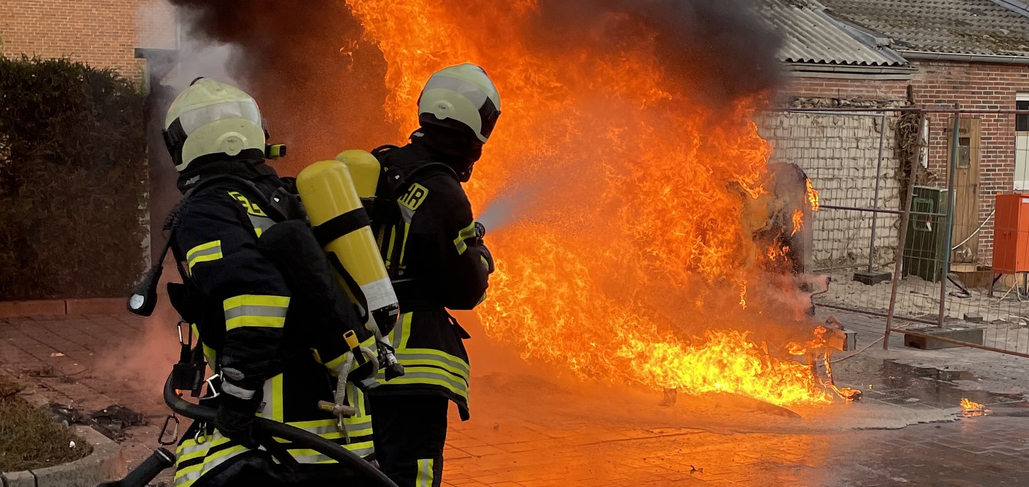 Dieser brannte beim Eintreffen der Feuerwehr bereits in voller Ausdehnung, woraufhin die Brandbekämpfung durch einen Trupp unter Atemschutz eingeleitet wurde. Im Verlauf der Löscharbeiten erkannten die Einsatzkräfte dann jedoch, dass sich eine Acetylen-Flasche innerhalb des Gespanns befand und somit einer enormen Hitzestrahlung ausgesetzt war. Das Ventil der Flasche wies bereits eine leichte Undichtigkeit auf, wodurch geringe Mengen des Inhaltes nach außen gelangten. Sofort gingen die mit den Löscharbeiten beschäftigten Atemschutzgeräteträger in Deckung und bekämpften den Brand fortan aus dieser heraus. Des Weiteren wurden geringe Mengen Schaummittel zur gezielten Bekämpfung des Feuers eingesetzt. Der Bereich um den Parkplatz musste zusätzlich weiträumig abgesichert werden.